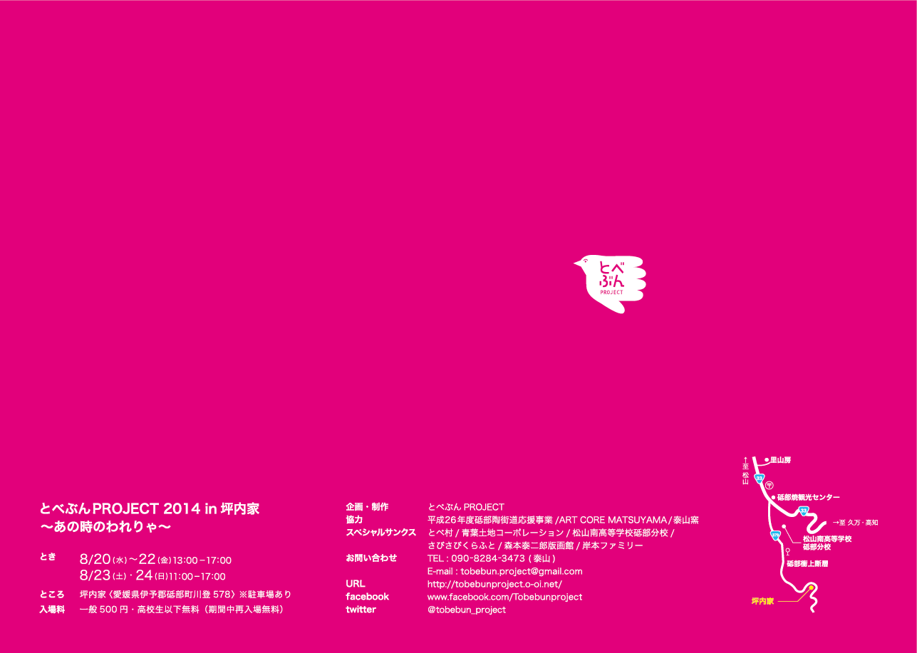 とべぶんproject 2014 2014 2014年07月10日 とべぶんproject 2014 「あの時のわれりゃ」日時:2014.8/20(水)〜8/24(日)時間:20−22日 13:00~17:00 ・ 23−24日 11:00~17:00場所:伊予郡砥部町川登578 ※駐車場有り入場料:一般 500円・高校生以下無料(※再入場無料)